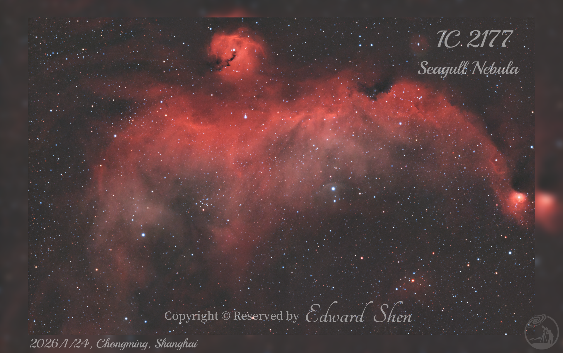 IC 2177海鸥星云 拍摄打卡 精选 拍摄地点: 上海市崇明区东旺路 东滩湿地公园 镜头/望远镜: 天虎 72ED APO 相机: QHY 268C 赤道仪: 小然双17谐波赤道仪 滤镜: Laida 7nm 双窄带 评 论 星友评论