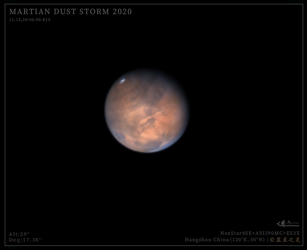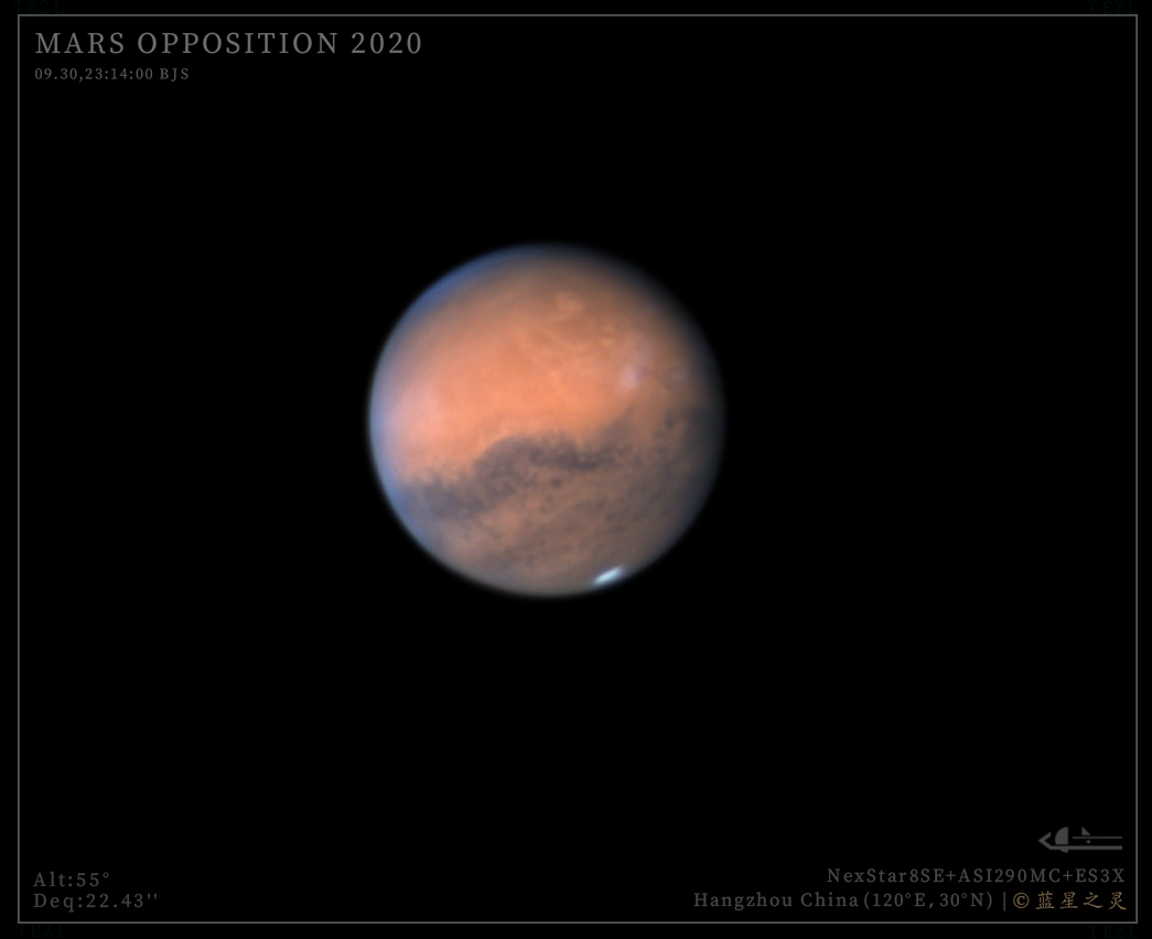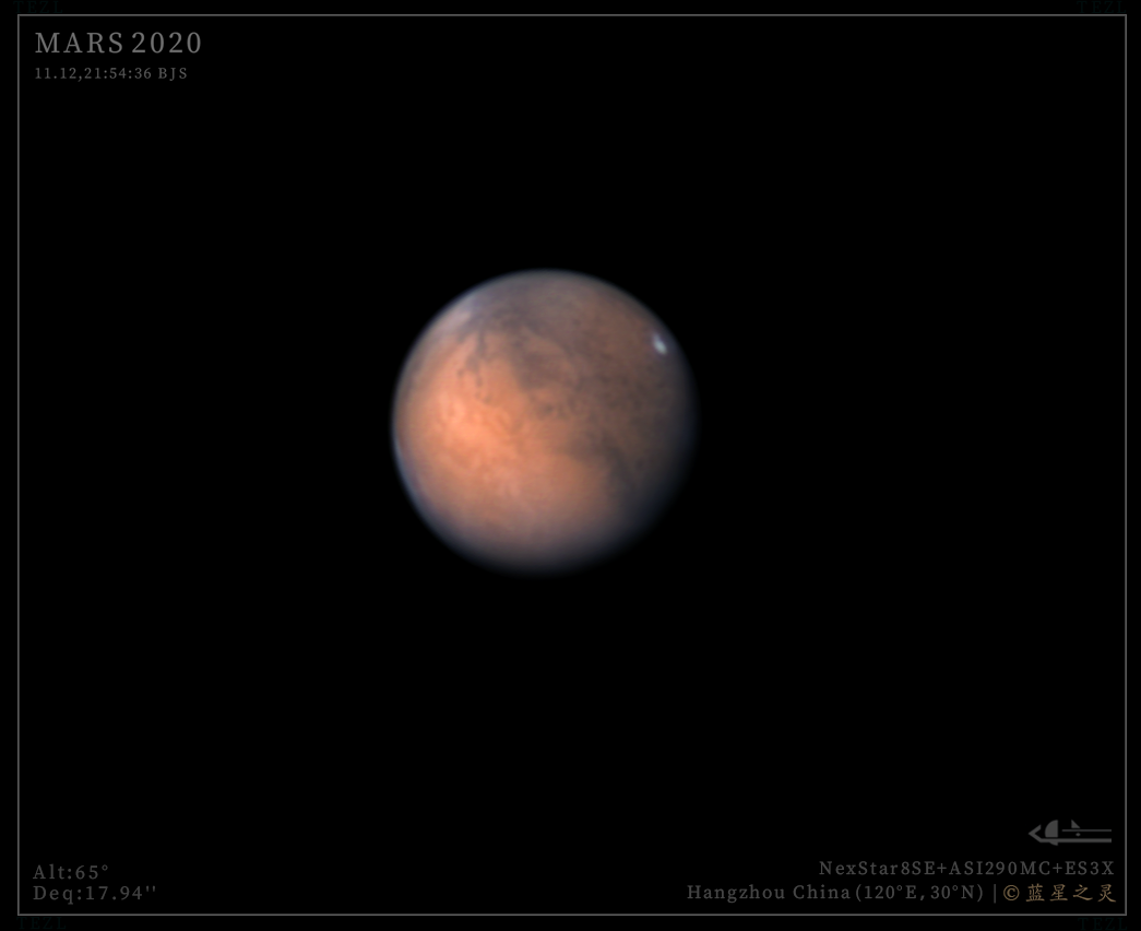 18年的火星大冲由于沙尘暴,没有在冲日期间观测到清晰的细节。时光来到2020,这次火星冲日的视直径依然很大,有22角秒以上。有晴天就出摊,遇到数次极品视宁度,留下了许多经典作品。 臻选 镜头/望远镜: NexStar8SE 相机: ASI290MC 评 论 星友评论