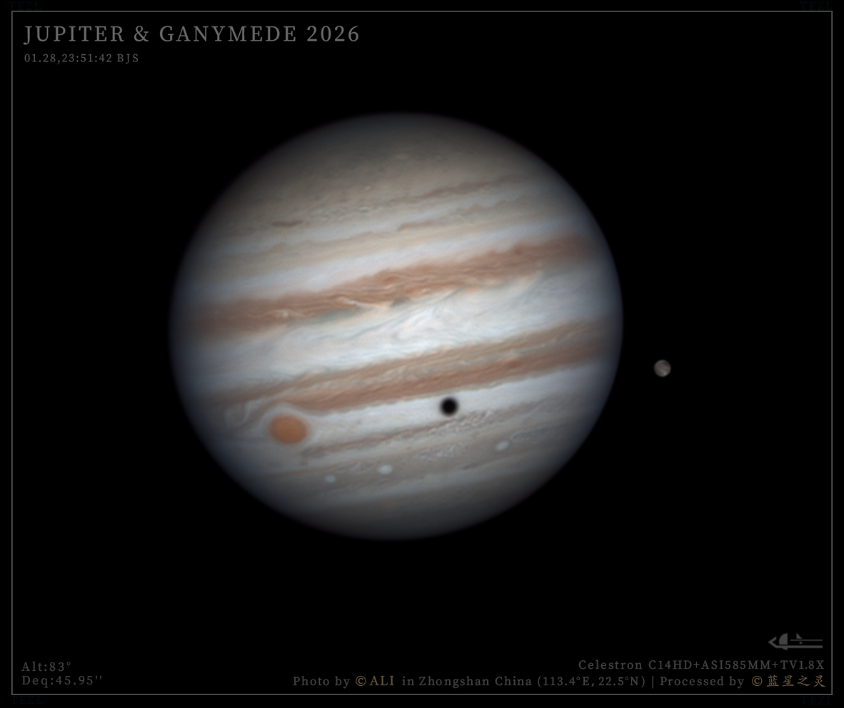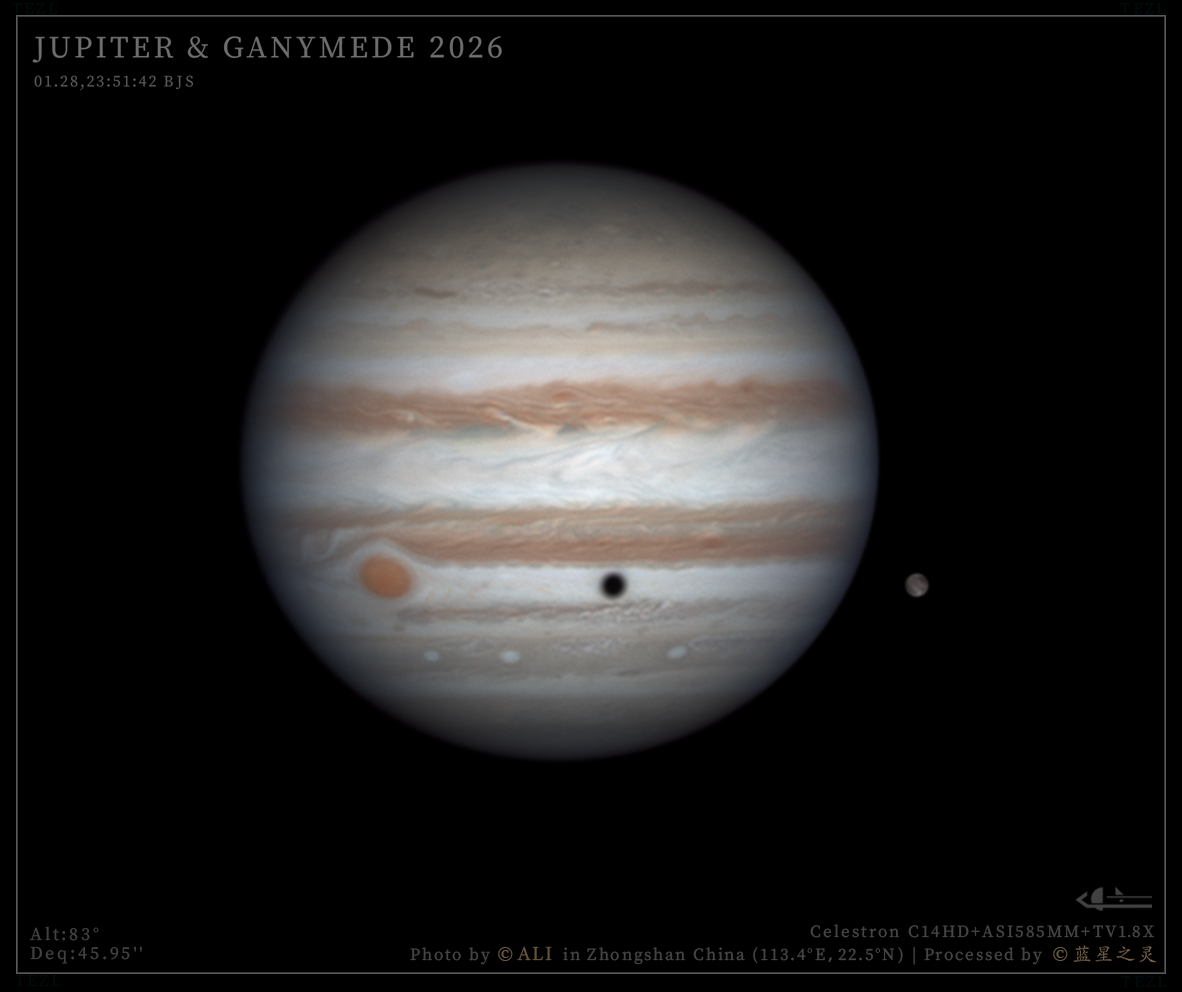 1月28日的木卫三凌木与影凌,高度角极佳,木星本身也在最佳观测时期。这组由ALI大佬拍摄的木卫三凌木素材质量很高,良好的视宁度也为解析细节提供了支持。在不同通道,木卫三细节的细腻程度很不一样--R通道衍射痕迹最粗大,而B通道相对细腻许多。我采用B通道素材作为木卫三明度细节,进行轻柔的锐化;再用RGB合成的素材作为颜色,最终将木卫三的细节与色彩呈现在作品中。